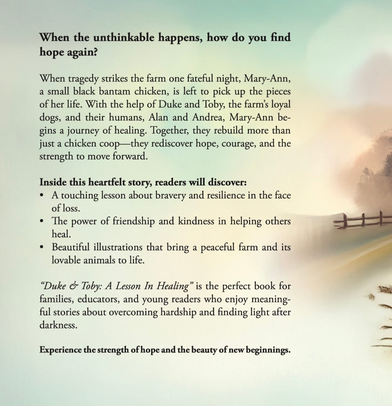 When the quiet farm is shaken by a tragic event, Mary-Ann, a small black bantam chicken, finds herself struggling to move forward. With the loving support of Duke and Toby—the farm’s loyal dogs—and their humans, Alan and Andrea, Mary-Ann begins a courageous journey of healing. Together, they rebuild more than just a chicken coop. They rediscover the power of kindness, resilience, and finding joy in life’s new beginnings.