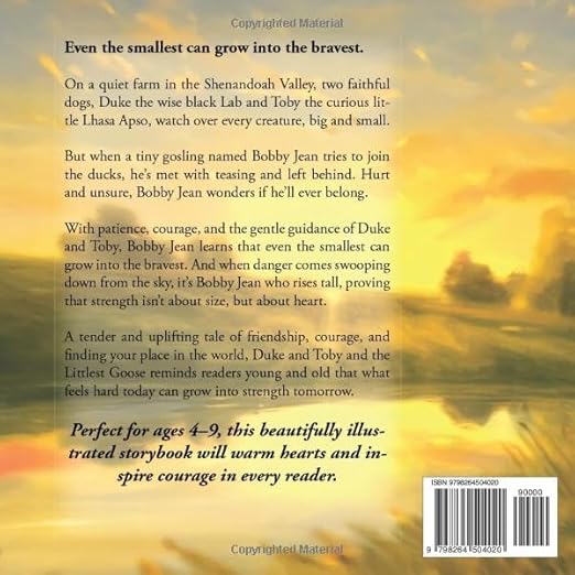 On a peaceful farm in Virginia’s Shenandoah Valley, two loyal dogs — Duke, a wise black Lab, and Toby, a curious little Lhasa Apso — watch over every creature. When a tiny gosling named Bobby Jean tries to join the ducks, he’s teased and left behind. Hurt and unsure, Bobby Jean wonders if he’ll ever belong.