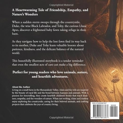When a fierce storm sweeps through the farm, Duke, the wise and loyal Labrador, and Toby, the curious and playful Lhasa Apso, stumble upon a tiny fawn separated from its mother. Guided by Andrea, their caring owner, the two dogs learn that sometimes the best way to help is to trust nature’s rhythms and give space for life to heal on its own.