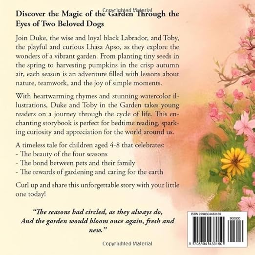 Step into the enchanting world of Duke and Toby in the Garden, a delightful children's story that follows the curious adventures of Duke, a wise black Labrador, and Toby, a playful white Lhasa Apso, as they explore the wonders of gardening and nature. Perfect for bedtime, this beautifully illustrated book gently introduces young readers to the magic of the four seasons, the cycle of life, and the rewards of hard work and teamwork.