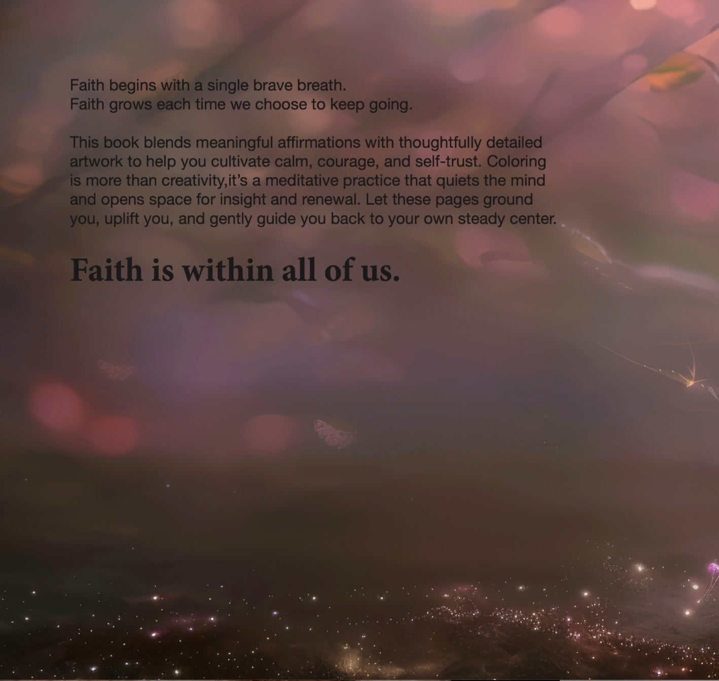 Inside this book, you’ll find a collection of simple truths and steadying reminders paired with intricate illustrations made for slowing down. Coloring is more than a creative break; it becomes a way of listening inward, giving shape to hope, and finding clarity in the everyday noise. Let these pages be a soft place to land when you need a little light.