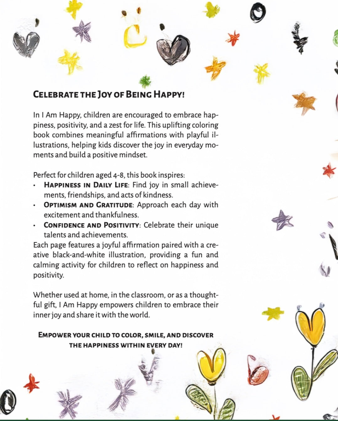 "I Am Happy" is a delightful coloring book designed to encourage children to celebrate happiness, embrace positivity, and build a zest for life. Part of the I AM series, this book combines uplifting affirmations with creative black-and-white illustrations, offering kids a fun and calming activity that nurtures emotional well-being and a positive outlook.